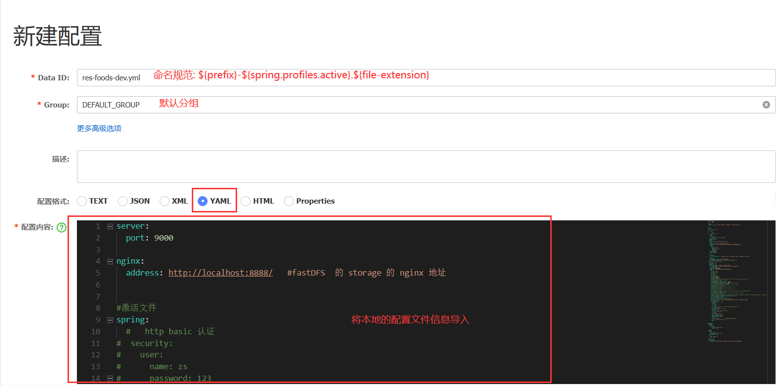 将配置格式改为yaml,然后将将本地的项目的application配置文件复制到配置中,并注释掉本地配置(避免启动项目时两者发生冲突)