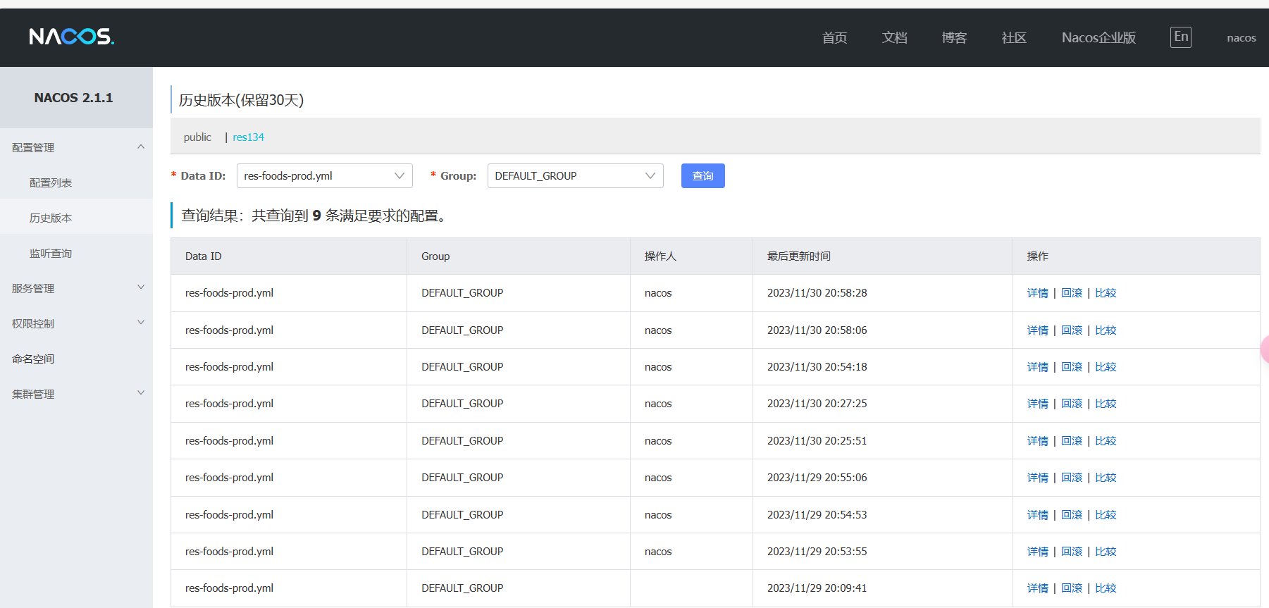 nacos提供了历史版本功能, 可以通过界面提供的历史版本模块来查看和管理配置的历史版本